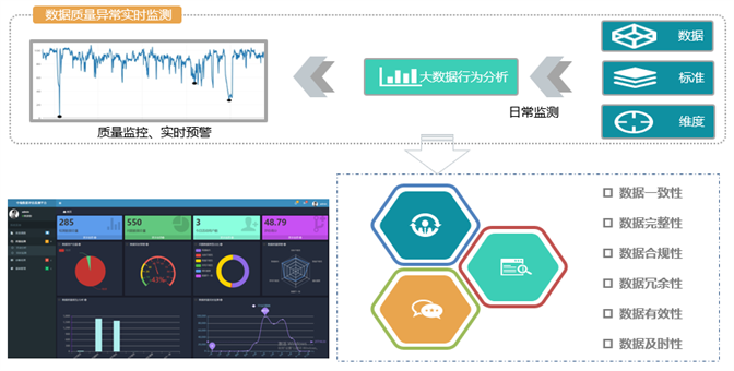 数据生成后就要运用大数据行为分析优化数据质量,如果数据源头是在某业务系统中,当数据生成后传输到数据治理平台时发现了质量问题,但这时此条数据已经在某业务系统产生了业务,数据评估监测平台还可以直接深入到该业务系统的相关单据进行静态数据质量的检核、处理,具体细节这里就不再赘述。