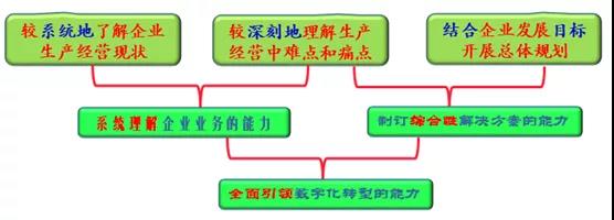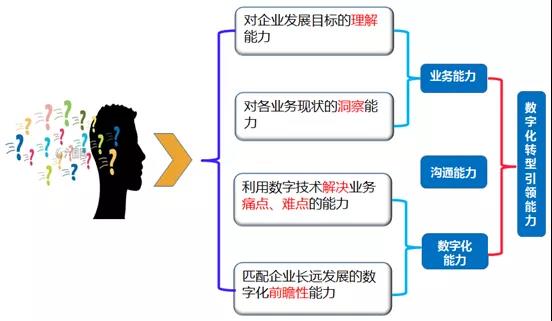 企业CIO在数字化转型中引领的能力主要体现在三大方面:业务能力、沟通能力及数字化能力。其中业务能力包括对企业发展目标的理解能力和对各业务现状的洞察能力;数字化能力包括:利用数字技术解决业务痛点、难点的能力和匹配企业长远发展的数字化前瞻性能力。