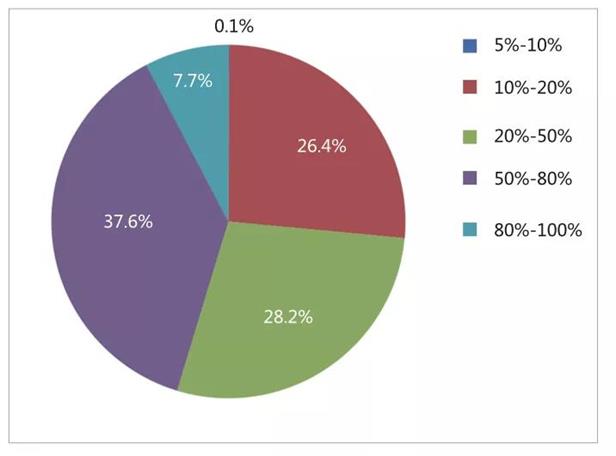 2019年统计,新建数据中心的平均机柜上架率主要集中在50%~80%之间,上架率低于10%和高于80%的占比较低。