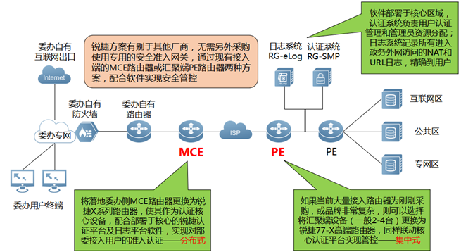 在助力电子政务外网建设中,锐捷网络双管齐下,打造安全接入的城域网方案和高效传输的广域网方案。其中委办安全接入解决方案,可保证各级政务外网符合国家等保三级的要求,实现对网络物理边界和业务边界的分别管理,有效隔离政务外网和互联网,规避信息泄密的风险,为实现十三五目标打造高效的互联网+政务服务平台。