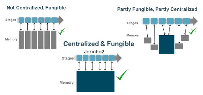 另外 Jericho2 真正的模块化表项结构,所有表项共享同一块物理缓存,极大增加了片上资源的使用效率。管线上所有处理节点可以并行访问,根据不同的应用场景进行逻辑表项的灵活划分,使得同样的硬件可以应用在完全不同的使用场景。丰富的表项资源使得新一代的网关能够完全满足用户现有甚至未来可见数年的规格需求。
