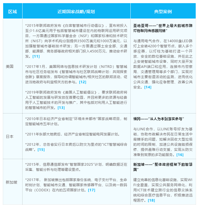 智慧城市作为未来城市的发展方向,许多国家都将智慧城市建设纳入国家战略,成为各国提升全球信息化竞争力的重点关注内容。德勤研究报告显示,目前全球在建智慧城市数量超过1000,无论是发达国家还是发展中国家,都积极参与到智慧城市的建设之中,推动新一轮的城市变革,现已形成了多个智慧城市群。[10]下表请见选取的三个智慧城市建设先驱国家的发展概况及典型案例列举。