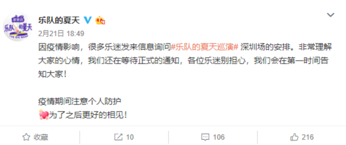 按照原来的计划,年后录制和开播的音乐综艺节目数量相当多,受到疫情影响的除了《歌手·当打之年》,还有爱奇艺的《乐队的夏天》第二季、腾讯视频的《创造营2020》、江苏卫视的《我们的乐队》、浙江卫视《天赐的声音》等。