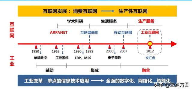 在当前工业领域,工业数字化已经是很重要的一块内容,也是工业转型升级很重要的推动力。工业互联网发展的大脉络有两个维度,上面是互联网的发展,下面是工业的发展。