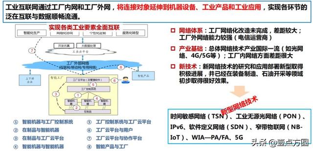 首先,网络基础设施是工业互联网的关键,工业互联网基于现有互联网,同时推动互联网发展和演进,以便满足安全、实时、可靠性等要求,包括工厂内网、工厂外网和标识解析。