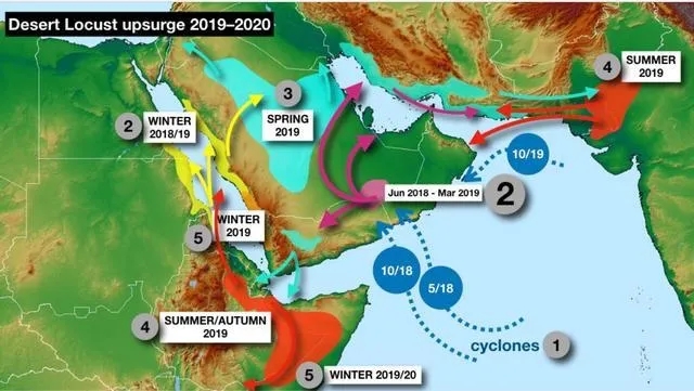之后,蝗群随着季风分两路,分别迁飞到东非和伊朗、巴基斯坦、印度等地,估计2000万人的口粮将受到影响。据联合国粮农组织表示:这是25年来,东非遭受最大的农业损失,多个国家几乎绝收。