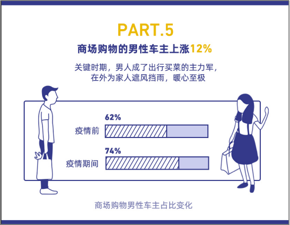 疫情期间,商场购物的男性车主上涨12%;行色匆匆,人们在商场的停车时长平均减少约42分钟;但有意思的是,人们抵不住内心消费冲动的行为已显现出来,并在2月14日情人节当天悄悄上演。