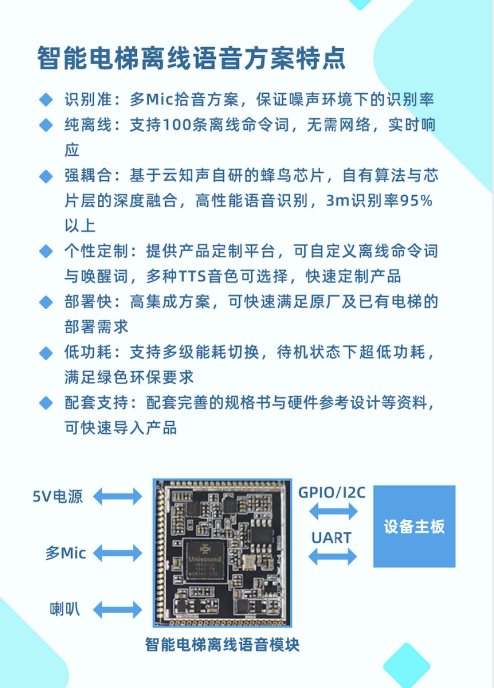 智能电梯离线语音模块是思必驰近期针对疫情推出的解决方案之一。如今市面上许多电梯的语音功能仅限于语音播报,在楼层到达开门时,播报该楼层以提醒乘客。思必驰方面提到,这种方式,只是在电梯主体之外单独外接一个感应模块,无法与电梯系统产生联动。智能电梯离线语音模块则希望赋能给电梯多一种指令交互的方式:无接触式的语音控制。