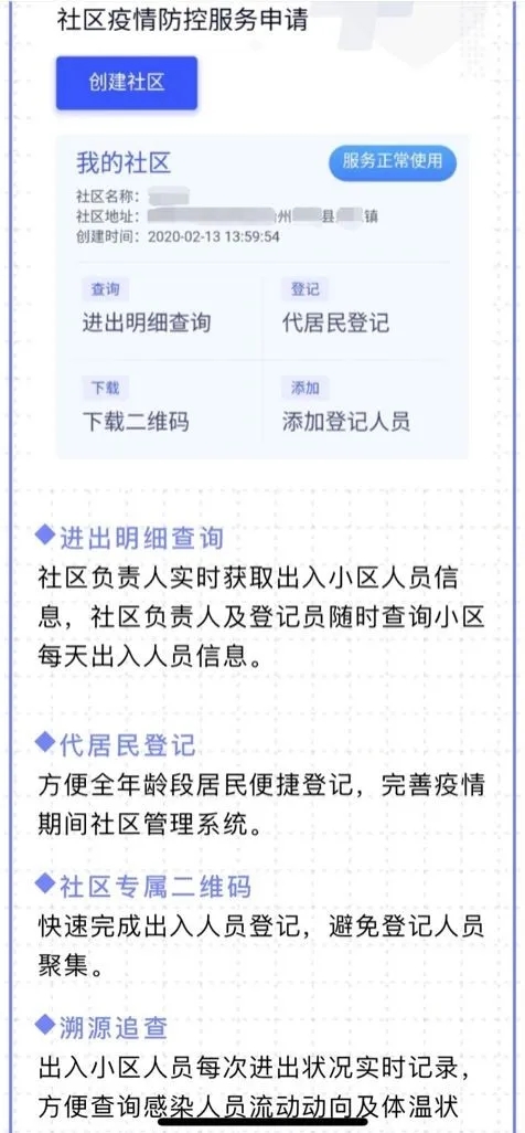 该系统具备操作简单、精准溯源、实时反馈三大特点,内嵌微信轻应用,所有人员均可通过微信进行管理或登记,信息汇总与提交方式安全、简便、快捷。区域管控单位可通过该系统实时掌握本区域人员的进出流动轨迹、定向溯源疫情接触者,实现"最后一公里"精准管控,也能够将本社区数据进行实时汇总,为未来的管控决策提供数据支持。
