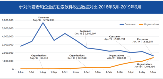 Malwarebytes2019年8月发布的报告显示,2018年第四季度开始,企业端的勒索软件攻击暴增,而面向个人的攻击则呈下降趋势。安全公司Malwarebytes指出: