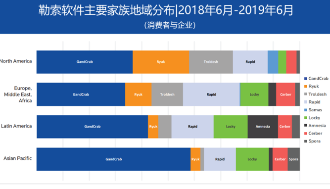 勒索软件这个一度休眠的危险物种,已经大范围地恢复了生命力,攻击活动从大规模的消费者活动转变为高度威胁的活动,尤其是面向企业的针对性手工攻击,该趋势与永恒之蓝漏洞利用有关。