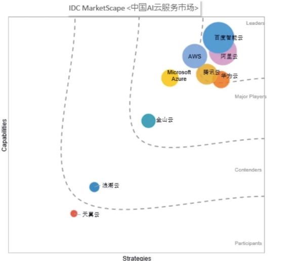 得益于AI技术,百度领跑中国AI云服务市场。2019年11月IDC发布《IDC MarketScape:2019中国AI云服务市场厂商评估》报告显示,百度智能云凭借着在AI技术、市场和商业上的优异表现,在能力和战略两个维度都处于领先地位,位居领导者象限最上方,在中国排名第一名,在其后有阿里云、AWS、腾讯云和华为云等云厂商。