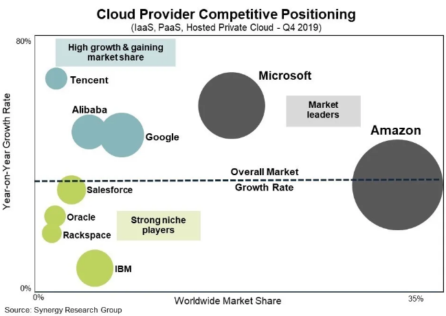 另外,依据Synergy Research发布的报告显示,腾讯已跻身全球云服务商上第一阵营。全球云服务包括IaaS,PaaS和托管私有云服务)市场排名前列的厂商分别是AWS、微软、谷歌、阿里和腾讯。在公有云服务中,前五大厂商控制全球四分之三市场份额。值得一提的是,谷歌、阿里和腾讯大大超过了整体市场的增长,同比增长了50%或更多。