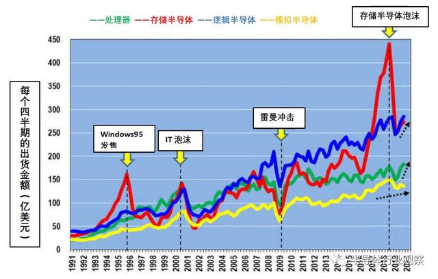 图1:各种半导体的每个四半期的市场动向(~2019年的第四季度)(图片出自:jbpress.ismedia,笔者根据WSTS的数据制作了此图)