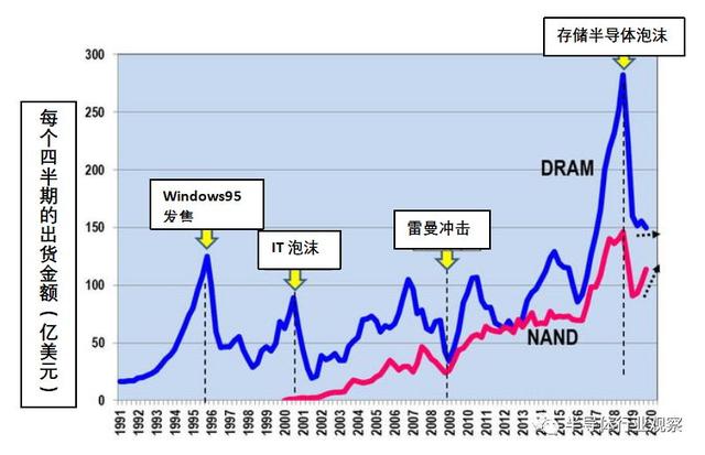 因此,原本生产的用于PC和服务器的DRAM、NAND等存储半导体“泛滥”于市场,引起了市场价格的暴跌,因此,在2018年的第3季度爆发了“存储半导体泡沫(Memory Bubble)”,2019年也成为了存储半导体大萧条的一年!(如图1)