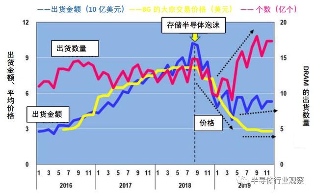 图3是2016年1月-2019年12月期间的DRAM的月度出货金额、出货数量、8G的大宗交易价格。此外,在今天的时间点,DRAM中8G是最大的容量,因此其价格多被当做DRAM的价格指标。本文,也以8G的价格为基础进行分析。