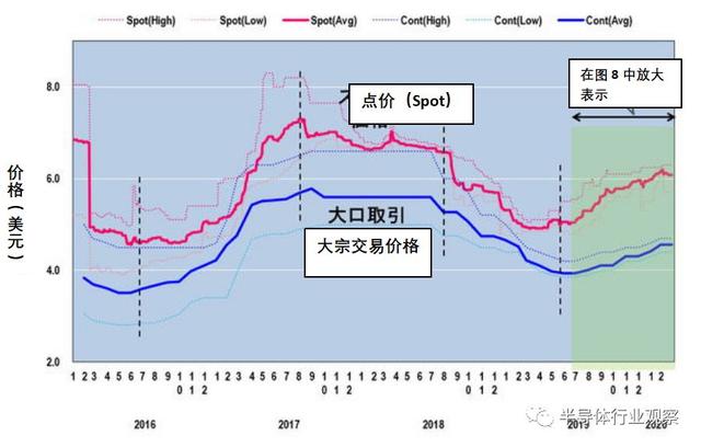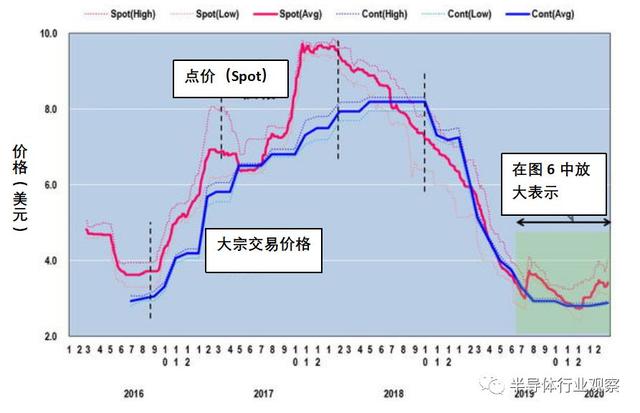 如图5所示,是8G DRAM的点价(Spot)和大宗交易价格。每个价格都有高(High)、低(Low)、平均(Avg)三种,平均(Avg)用实线表示,高(High)和低(Low)用虚线表示。