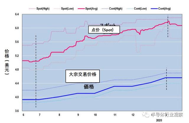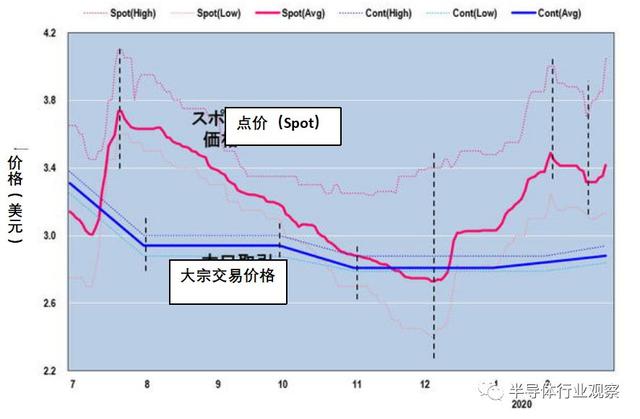 大宗交易价格(Contract Price)也就是“正规途径”的价格,点价(Spot Price,现货价格)也就是所谓的“幕后渠道”的价格。大宗交易价格指的是DRAM厂家销售给大型电脑厂家、大型存储半导体模组厂家(Memory Module Maker)的正规的价格,每月一次,在月末DRAM厂家和客户协商新的价格。