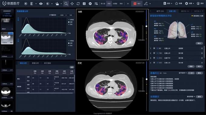 针对医院对新冠肺炎的诊疗决策需求,依图在疫情期间开发了基于CT医学影像的“胸部CT新型冠状病毒肺炎智能评价系统”。