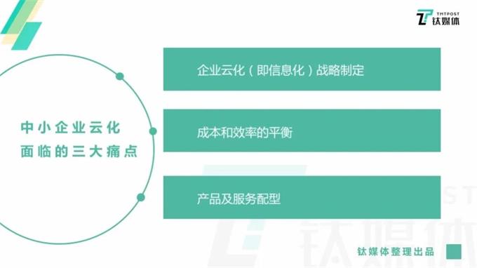 中小企业云化,首先面临三大痛点问题:企业云化(即信息化)战略制定,成本和效率的平衡,以及产品及服务配型。