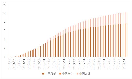 图:4G商用后,三大运营商4G用户数增长情况(单位:亿户)