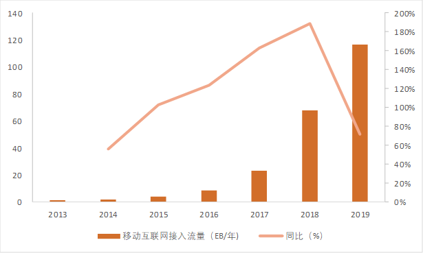中国数据流量增长则更加明显,2014年以来,已呈现爆发增长趋势,且增速不断提升。2018年,移动互联网接入流量达到66.22E,同比增长189.10%。用户数增长和单用户贡献的流量增加驱动移动互联网接流量快速增长,且月户均流量的增加对整体的拉动作用越来越重要。2019年12月,我国移动互联网接入月户均流量达到8796MB,同比增长37.44%。随着我国5G进入商用阶段,移动互联网带来的数据增长速度将迎来新的高峰期。