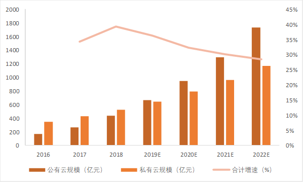 云计算作为IT基础设施已经成为共识,新增的计算、存储等需求催生云计算建设,而传统的IT架构也加速向云计算转型。据中国信通院测算,2018年,我国公有云市场规模达到437亿元,同比增长65.2%,预计2019年-2022年期间,市场规模将处于快速增长阶段,2022年,市场规模有望达到1731亿元;2018年,我国私有云市场规模为525亿元,同比增长23.1%,预计2019年-2022年期间,将保持较快增长,2022年市场规模有望达到1172亿元。2018年我国公有云及私有云市场规模合计达到962.8亿元,同比增长39.2%,增速显着快于全球水平,后续数年都将处于追赶阶段。