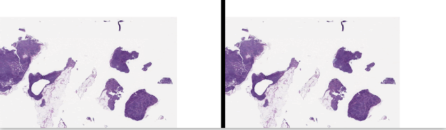 左侧:含有微转移淋巴结的载波片的放大图 右侧:相同视图,在 LYNA(LYmph Node Assistant)辅助后用蓝色标注出肿瘤的位置