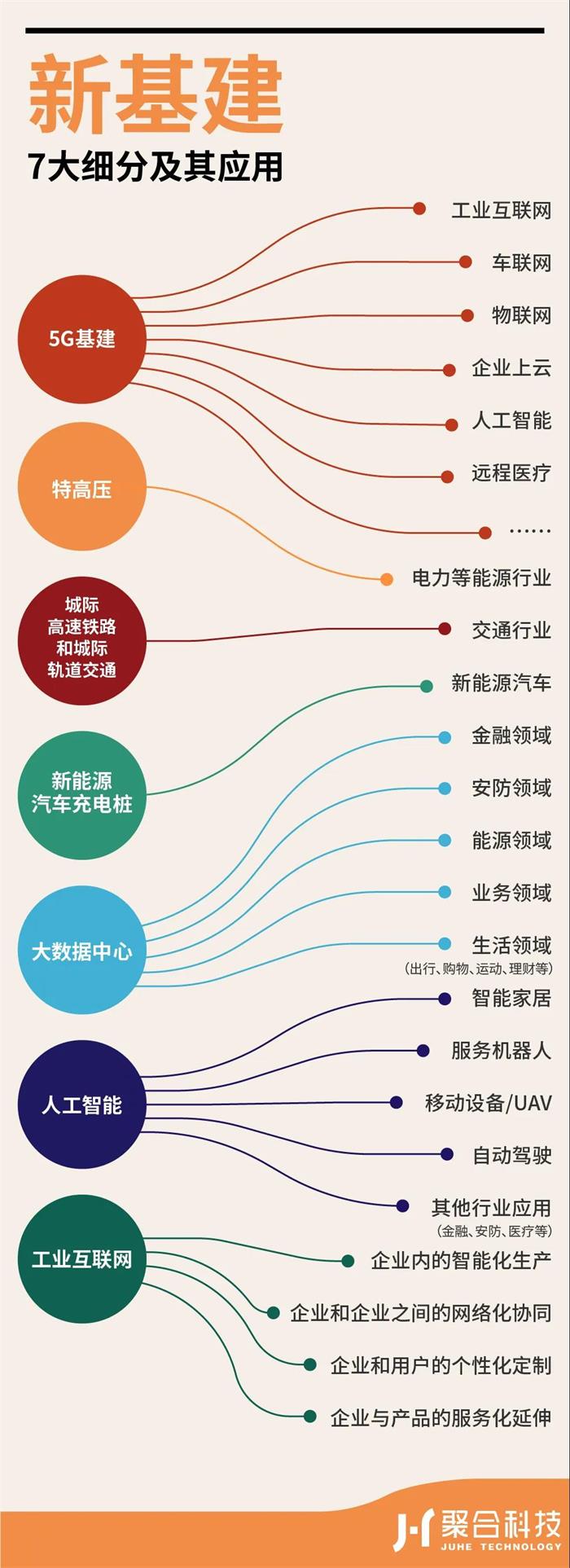 虽然中央相关文件中还没有给出关于新型基础设施建设的具体范围,但根据官媒盖章,“新基建”主要包括七大领域:5G基建、特高压、城际高速铁路和城市轨道交通、新能源汽车充电桩、大数据中心、人工智能、工业互联网。