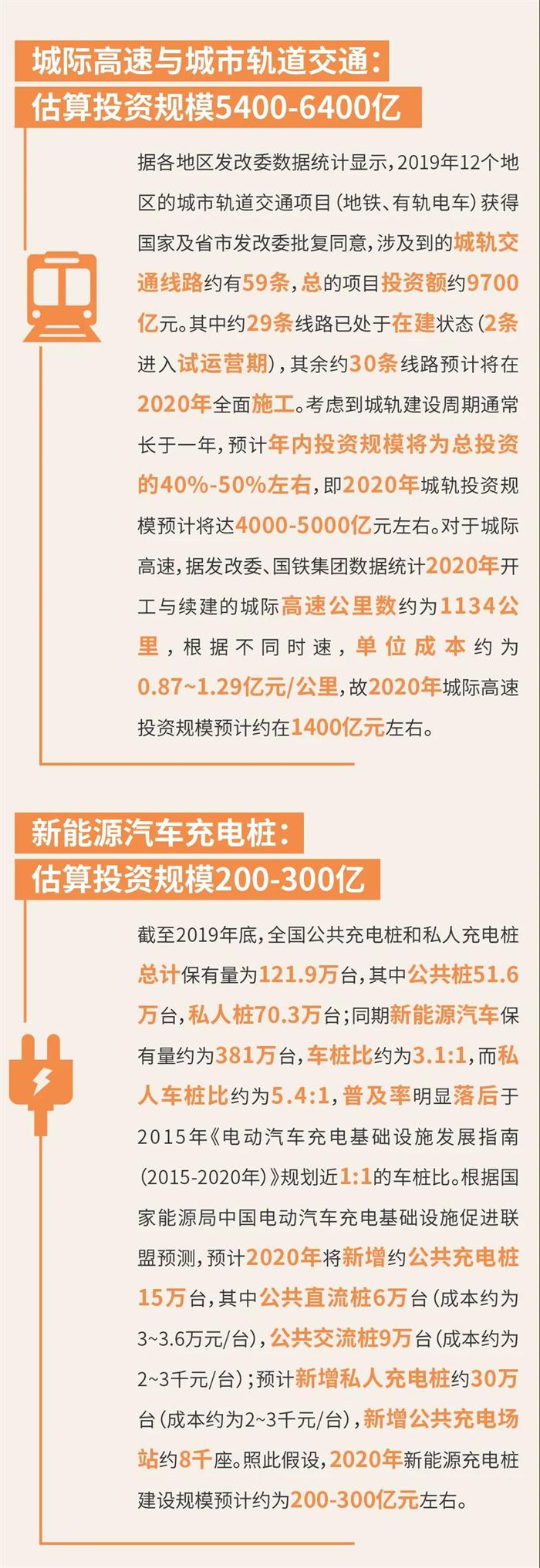 2020年要实现经济和社会发展目标,则全年GDP需要达到5.5%左右,这意味着固定资产投资不能低于5%。在地产投资已经显着低于去年、制造业投资一般顺周期的背景下,基建需要扩张至10%左右。如此推算,七大领域“新基建”的年内投资规模乐观来看,可能在1.1万亿左右(大约占去年基建投资总额的6%)。