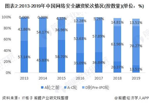 近年来,中国网络安全融资流向从早期融资轮次转向较为成熟的融资轮次。2013-2019年,A轮之前的融资占比整体呈下降趋势,从2013年的57.14%下降到2019年的13.51%;而A-C轮融资占比呈现上涨趋势,从2013年的42.86%上涨到2019年的70.27%。D到Pre-IPO占比也逐渐增长,2019年达到13.51%。