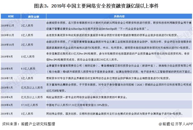随着中国网络安全行业的快速发展,网络安全行业深受资本的青睐,亿元级别的大额投融资频频出现。2019年国内网路安全最大投资额融资事件为中国电子以人民币37.31亿元持有奇安信22.59%股份。