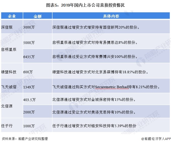 2019年,国内上市公司更加倾向于对企业进行直接投资,如深信服、启明星辰、绿盟科技等对其他企业进行直接投资,其中启明星辰投资了易捷思达和赛博兴安两家公司,对赛博兴安实行100%控股。而北信源也投资于金城保密和美洛克思,分别持有金城保密15%的股份和美络克思10%的股份。