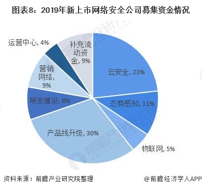 五家上市公司首发募集资金主要投向产品线升级、云安全、态势感知、物联网等,其中产品线升级和云安全领域成为主要投资方向,分别募集资金为8.02亿元和6.12亿元 ,占比分别为30%和23%。