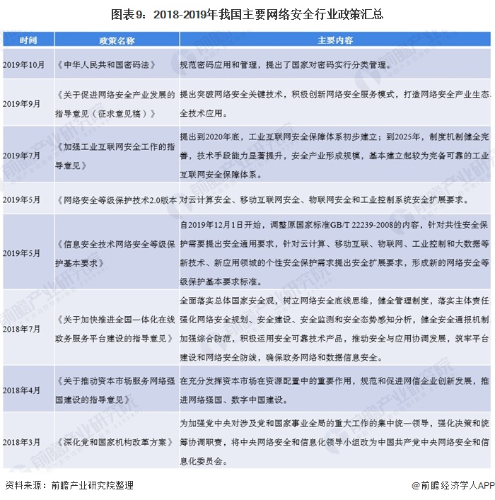 近年来国家政策为网络安全行业的发展提供了新的契机和更有力的支持。2013年11月,国家安全委员会正式成立;2014年2月,中央网络安全和信息化领导小组成立;2016年11月,我国通过《网络安全法》;2019年7月,《加强工业互联网安全工作的指导意见》中提出到2020年底,工业互联网安全保障体系初步建立,到2025年,制度机制健全完善,技术手段能力显着提升,安全产业形成规模,基本建立起较为完备可靠的工业互联网安全保障体系。这无不展现出国家对网络安全行业的投资和对安全技术发展方向的指引。