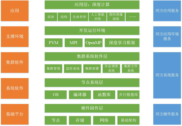 作为同方股份与清华大学在高性能计算系统的研究、建设与服务领域的合作成果,双方联合成立“清华大学-同方股份有限公司计算机系统结构联合研究中心”。 提供先进的高性能计算系统整体设计、建设方案和强大的服务、保障能力,致力于科技成果转化和HPC应用的行业普惠,形成了基于HPC & AI相结合的高性能计算平台参考架构: