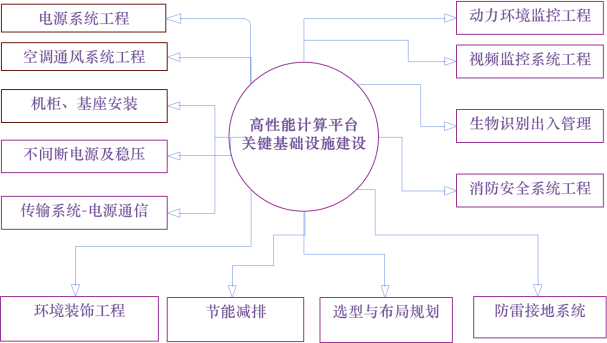 同时,基础设施及配套工程作为高性能运算设备的承载平台,本方案从运行环境的安全、稳定、可靠角度出发,对空间布局规划、环境参数、动力配电、制冷、智能管理、消防等方面精细设计。采用了多项行业创新领先的数据中心节能降耗技术,符合国内最高节能标准,满足国家、地方及行业标准,保证平台安全高效运行。