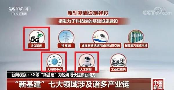 在中央电视台中文国际频道的定义中,新型基础设施建设是指发力于科技端的基础设施建设,主要包含 5G 基建、特高压、城际高速铁路和城际轨道交通、新能源汽车充电桩、大数据中心、人工智能、工业互联网等七大领域,涉及到通信、电力、交通、数字等多个社会民生重点行业。
