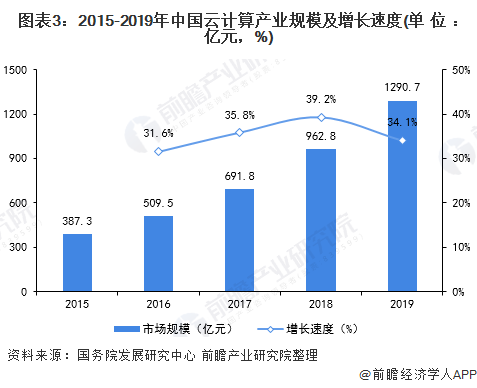 近年来,在产业转型的过程中,我国各行业企业纷纷利用云计算、人工智能等新兴产业技术,提升生产效率、创新能力和资源利用率,带动发展模式变革,为最终实现数字化转型奠定了坚实基础。在政府、产业的双重推动下,云计算技术在我国得到迅速推广,2018年我国云计算产业规模为962.8亿元,同比增长39.2%;初步测算,2019年市场规模突破千亿元,达到1290.7亿元。