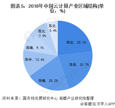 从区域角度来看,华北、华东、华南是中国云计算产业的发展的主导区域,市场份额比重分别为23.1%、21.7%和20.2%,主要是因为这些区域集中了中国主要的互联网企业和金融、消费品、制造等行业用户。其余的华中、西南、西北和东北占比分别为12.6%、9.1%、7.9%和5.4%。