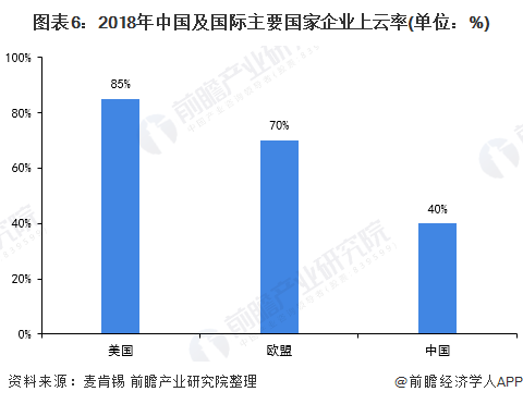值得注意的是,尽管我国云计算呈高速增长的态势,但中国企业上云率与欧美主要国家企业仍有较大差距。根据麦肯锡研究数据显示,2018年,美国企业上云率已经达到85%以上,欧盟企业上云率在70%左右,而中国企业的上云率只有40%左右。云计算作为数字经济核心基础设施,未来仍有很长的路要走。