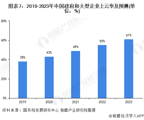 未来,随着我国政府和企业业务创新、管理变革等的不断深化,同时伴随数字化、网络化、智能化转型需求的提升,将带动政府和大型企业上云趋势加快,预计到2023年上云率中国政府和大型企业上云率将超过60%。
