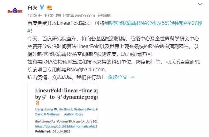 比如说,在疫情刚刚开始爆发的1月30日,百度就宣布向各基因检测机构、防疫中心及全世界科学研究中心免费开放线性时间算法 LinearFold,以提升新型冠状病毒RNA空间结构预测速度,从而助力疫情防控。