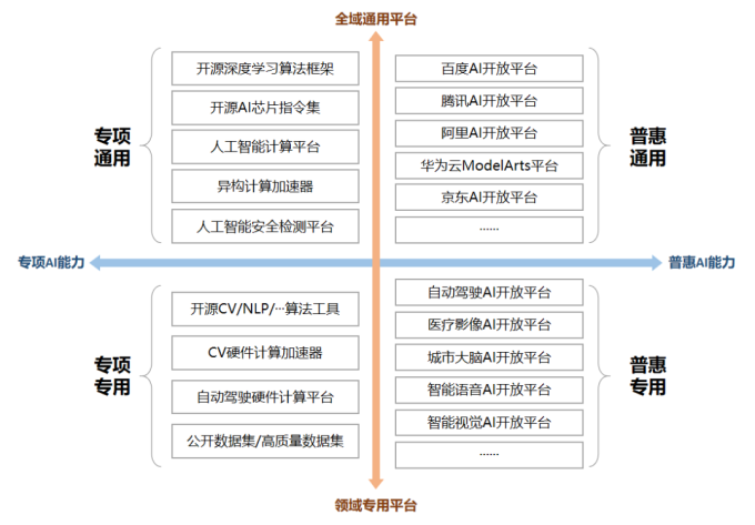 从目前人工智能产品和服务提供方式来看,“AI新基建”呈现出四种形态。一是专项通用类,可面向全行业全领域提供专项AI能力,如开源深度学习算法框架、开源AI芯片指令集、人工智能计算平台、异构计算加速器、安全检测平台等。二是专项专用类,只面向特定领域提供专项AI能力,如开源CV算法工具、CV硬件计算加速器、开源NLP算法工具、自动驾驶硬件计算平台、数据集等。三是普惠专用类,只面向特定领域提供普惠AI能力,典型代表就是科技部主导的新一代人工智能创新开放平台,如自动驾驶开放平台、城市大脑开放平台、智能语音开放平台、医疗影像开放平台、智能视觉开放平台等。四是普惠通用类,可面向全行业全领域提供普惠AI能力,如百度、阿里、腾讯、华为、京东等行业领军企业推出的普惠AI开放平台已经具备一定的基础设施属性。