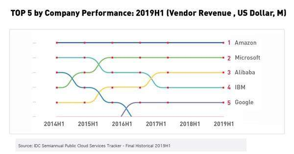 在过去五年时间里,云计算也是科技行业最热门的领域之一,全球知名的互联网科技公司中,几乎都有对云计算进行布局,根据时差昂研究机构IDC公布的2014-2019年全球云计算市场增速报告,此次入围前五的企业分别是亚马逊、微软、阿里云、IBM和谷歌。