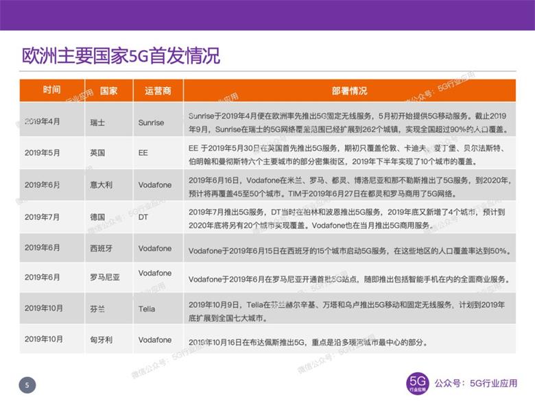 德国于2019年7月推出5G服务,DT当时在柏林和波恩推出5G服务,2019年底又新增了4个城市,预计到2020年底将另有20个城市实现覆盖。Vodafone也在当月推出5G商用服务。