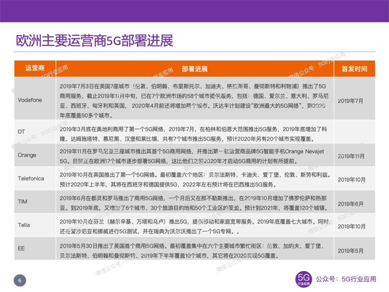 DT(Deutsche Telekom)于2019年3月底在奥地利商用了第一个5G网络,2019年7月在柏林和伯恩大面积推出5G服务。后续又增加了科隆、达姆施塔特、慕尼黑、汉堡和莱比锡,截止2019年底共在7个城市推出5G服务,预计2020年还会再增加20个城市实现5G覆盖。