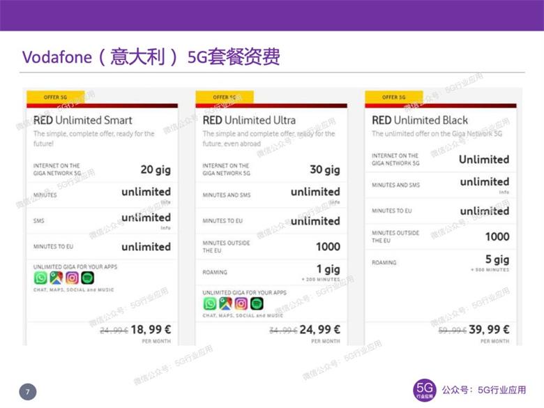 其次,5G资费定价面临压力。除英国之外,意大利、瑞士、西班牙等国家推出的5G套餐和4G的资费基本相同,基本没有或很少为5G收取额外费用。Vodafone在意大利和西班牙甚至为部分企业客户免费提供5G服务。