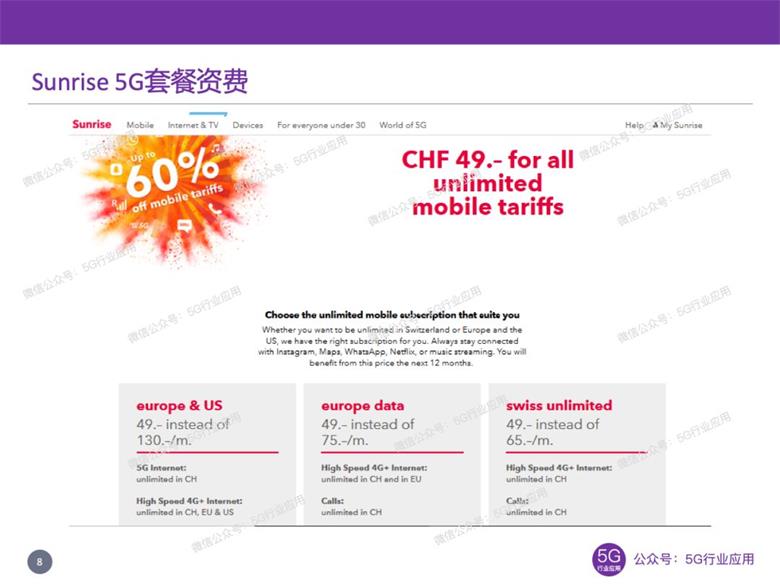 Sunrise在瑞士推出的5G服务,也不收取额外费用,促销期间每月和4G资费相同,仅收取49欧元。