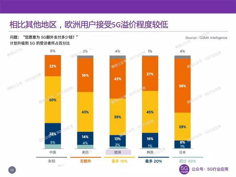而在一项愿意为5G服务支付多少额外费用的调查中,欧洲用户也更加保守和谨慎,其中43%的用户不愿意支出额外费用,远远大于中国、韩国和美国。